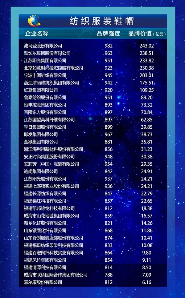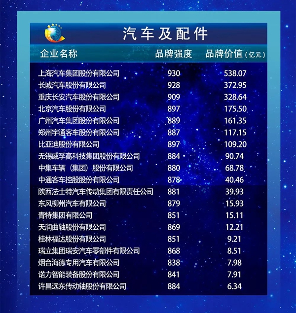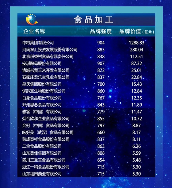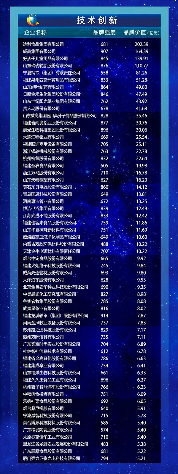 经河南省市场监督管理局、河南省品牌质量检验协会推荐,河南双汇投资发展股份有限公司、郑州宇通客车股份有限公司、西继迅达(许昌) 电梯有限公司、新乡化纤股份有限公司、河南慧洁管业有限公司、白象食品股份有限公司、郑州思念食品有限公司、三全食品股份有限公司、河南华英农业发展股份有限公司、河南金凤牧业设备股份有限公司、许昌远东传动轴股份有限公司、河南华星粉业集团、河南中鹤现代农业开发集团有限公司、怀山药、灵宝苹果、汝瓷、正阳花生、柘城辣椒、汝阳红薯,共10家企业品牌、1家产品品牌、2家技术创新品牌和6个区域品牌(地理标志产品)荣登榜单。